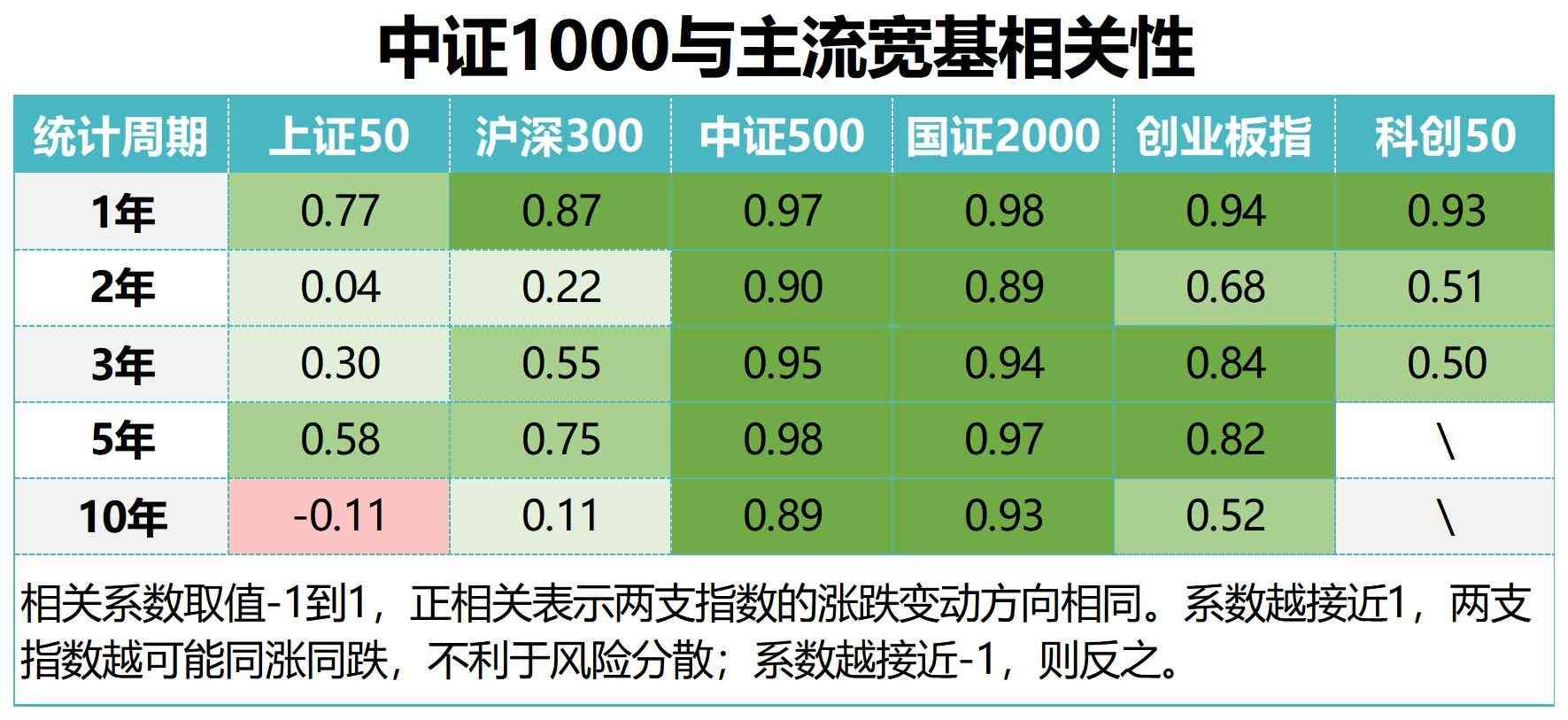 上图展示中证1与其它几个宽基指数在近1、2、3、5、10年历史表现的相关性。