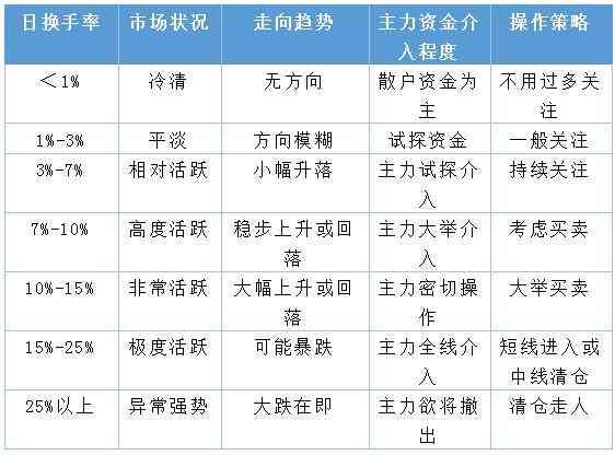 一般来说,日换手率较高的股票,往往是短线资金追逐的对象,通常以热门概念股居多,投机性较强,股价起伏较大,风险也较高。以下我们为大家做了一个关于日换手率的操作策略参考表: