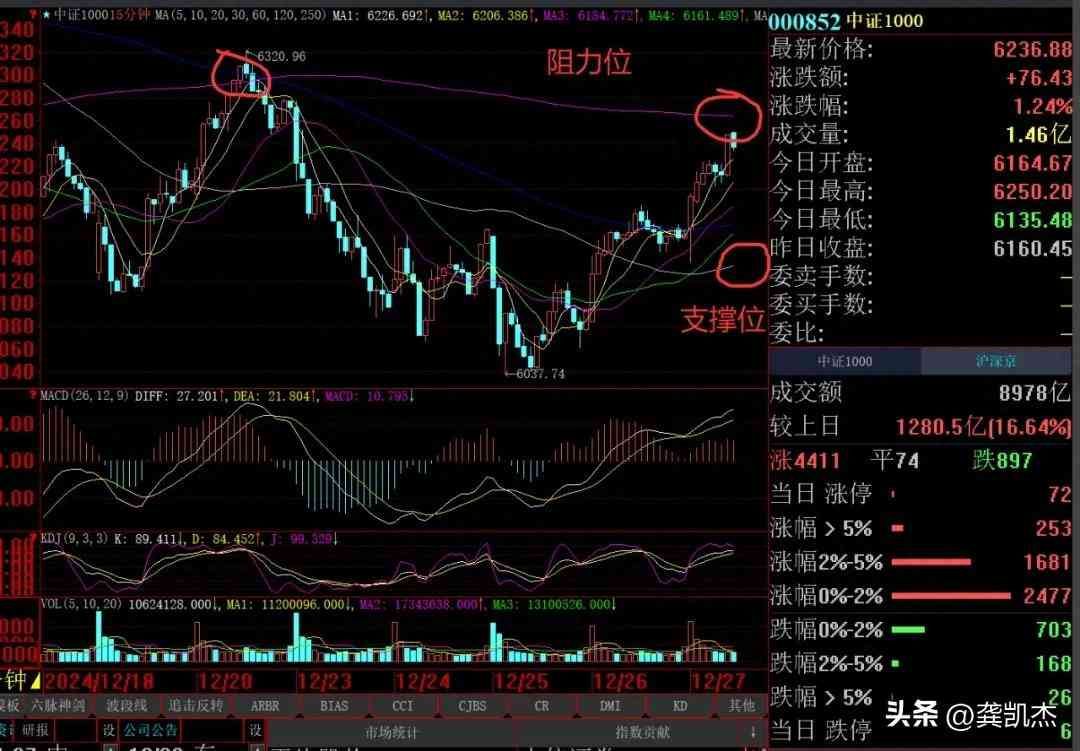 因为大盘指数受银行,保险等权重股影响,意义不大,所以我们留意中证1指数的走势,现在15分钟K线图,面临250分钟均线的阻力位,能不能站上去,代表完全走强的信号,要是冲高回落,也是正常的,就看60分钟均线的支撑,回踩不破支撑位,问题不大!