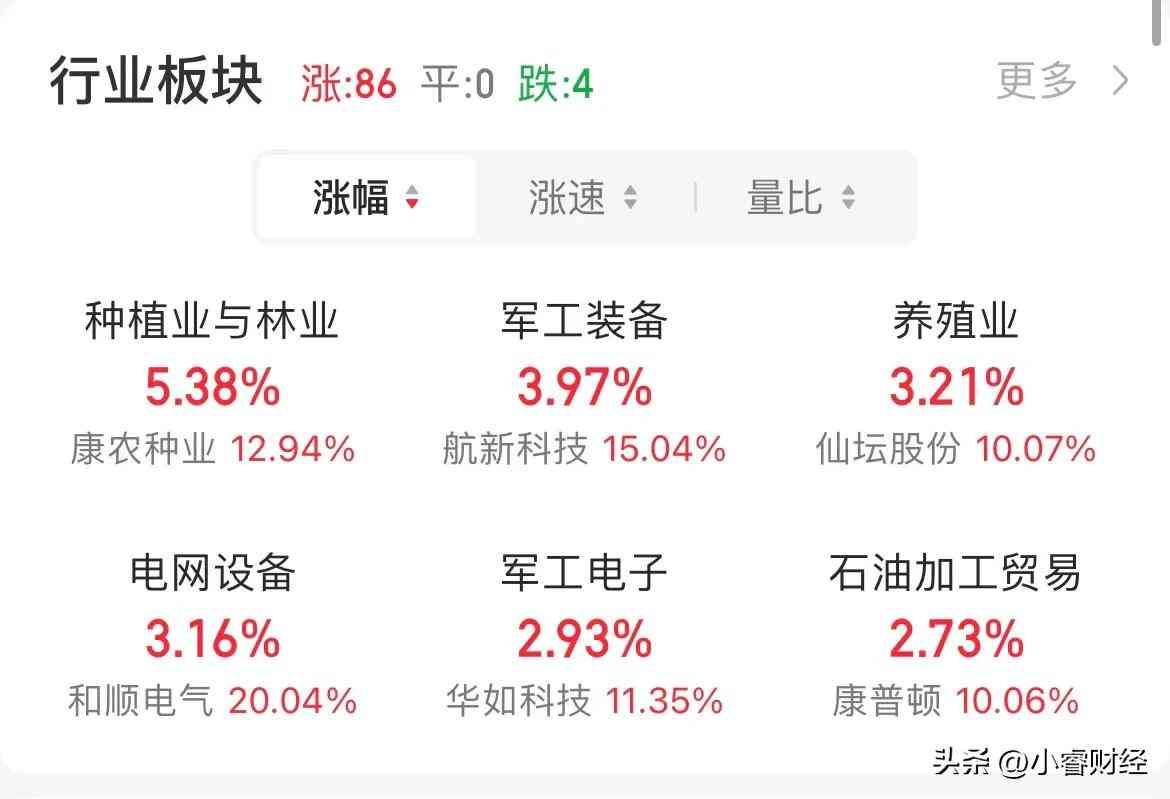 我们接下来再来看看板块方面,今天种植业与林业,养殖业、军工的板块涨幅居前,板块方面今天的表现还算是中规中矩!军工板块由于昨晚的利好,今天表现不俗,但是板块上涨的持续性还有待观察,可以先适当关注。