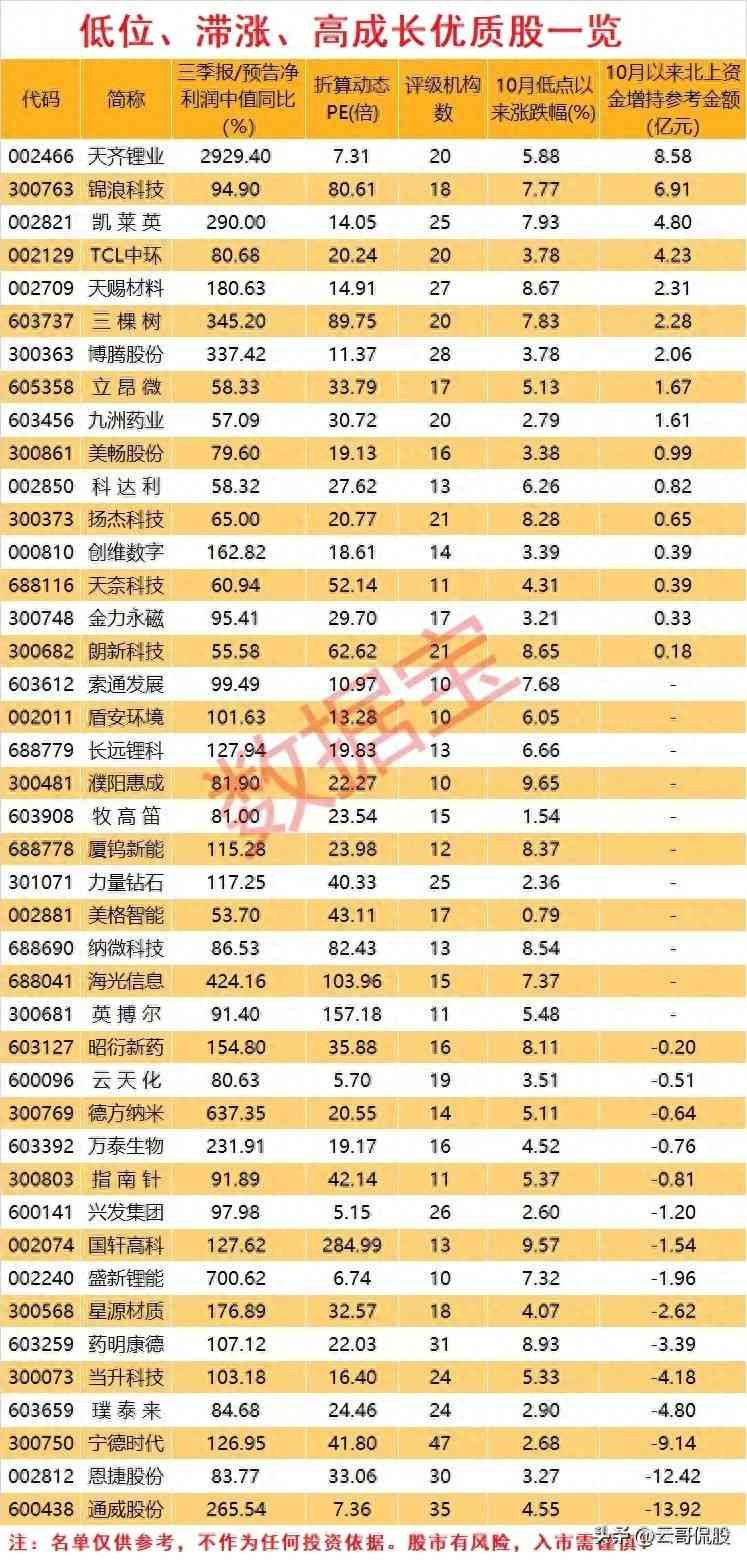 最后。为了方便大家研究,我用图表形式的形式,把42只个股的三季报、PE、北上资金增持等情况都全部列出来。当然这都是个参考,不做推荐的依据。大家一定要注意投资风险,结合自己的认知来判断,筛选出一些自己看好的标的进场观察,再寻找合适的介入时机。