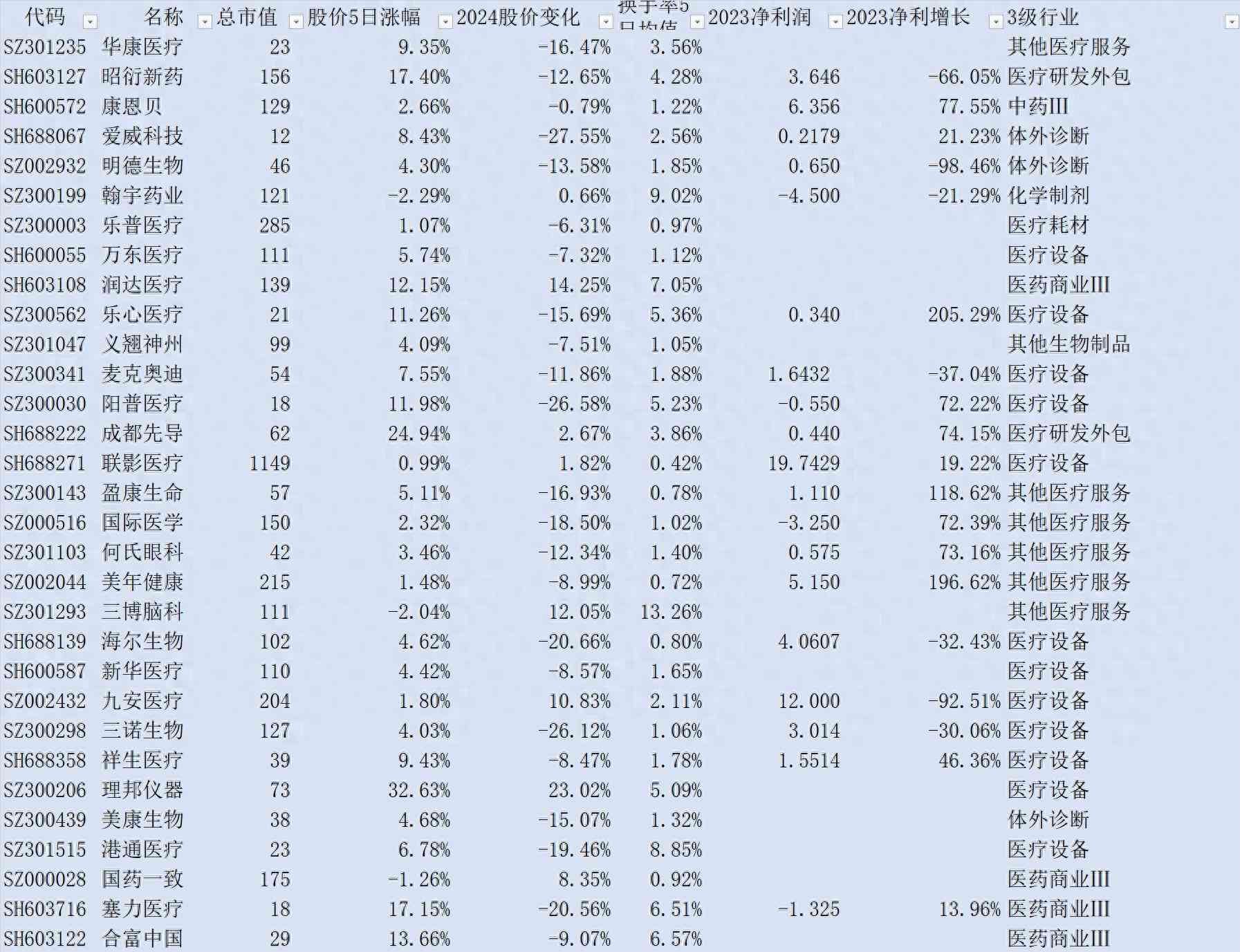 (1)16只医疗器械股,分别是麦克奥迪 海尔生物 阳普医疗 新华医疗 明德生物 九安医疗 三诺生物 联影医疗 爱威科技 祥生医疗 乐心医疗 乐普医疗 万东医疗 理邦仪器 美康生物 港通医疗