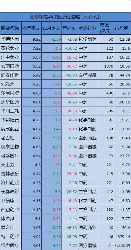 12月20日的收盘数据显示,在近5家A股医药生物行业上市公司中,共有24只股息率(近12月,截止12月20日,下同)超过4%。华特达因股息率近10%,另有多只股息率超过5%。下面来看下详细的数据。