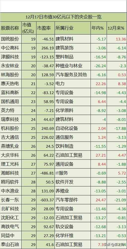 近期,央企并购浪潮正盛,小市值央企公司值得重点关注。根据12月17日的收盘数据,我整理出24家市值在30亿元以下的央企股,供大家参考。