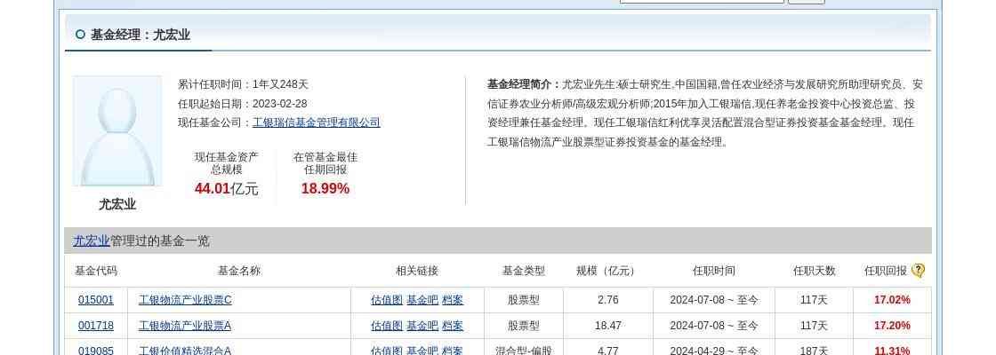 简历显示,尤宏业先生:硕士研究生,中国国籍,曾任农业经济与发展研究所助理研究员、安信证券农业分析师/高级宏观分析师;2015年加入工银瑞信,现任养老金投资中心投资总监、投资经理兼任基金经理。现任工银瑞信红利优享灵活配置混合型证券投资基金基金经理。现任工银瑞信物流产业股票型证券投资基金的基金经理。