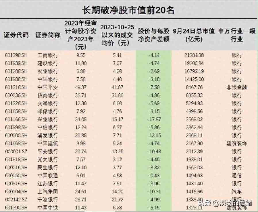 以下是20家是长期破净且市值前20的公司:民生银行,破净超80%;兴业银行、平安银行破净超50%;交通银行、中国建筑、浦发银行破净45%。