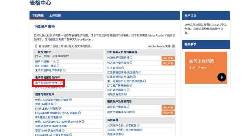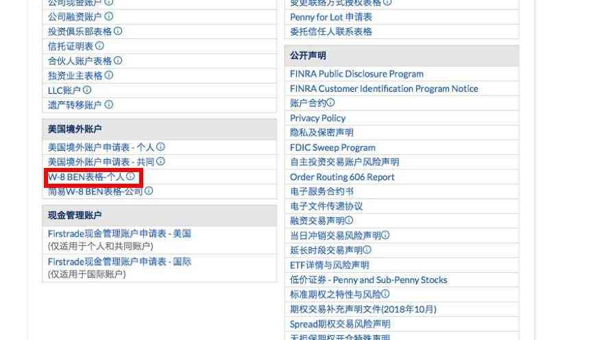 2. 打开表格中心后找到“电子交易服务合约书“和“W-8BEN表格-个人”,下载并填写。解释一下,美国公民股票获利需要缴30%的资本利得税,而外国人则不需要,W-8BEN表格就是证明你是个外国人。