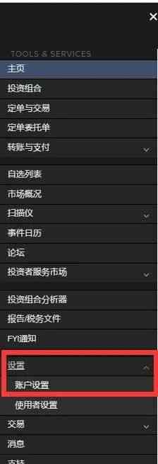 1.登录盈透官网,官网地址自行百度,然后设置账号密码,登录首页后可以在左侧导航栏中找到:设置——账户设置的选项。