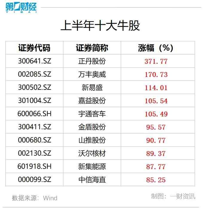 在剔除上半年上市的新股后,截至6月28日收盘,上半年十大牛股中涨幅最大的为正丹股份,累计涨幅达371.77%,5只股票上半年涨幅超过1%。其中,低空经济板块表现抢眼,上半年十大牛股中万丰奥威、金盾股份、中信海直均为低空经济概念股。