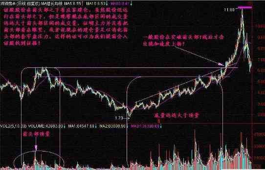 图形特征:(1)股价在冲过前一头部时放出巨大的成交量。(2)有时是单根巨大阳线,有时是温和放量的几根阳线,总之在冲过前头部时有成交量的配合。