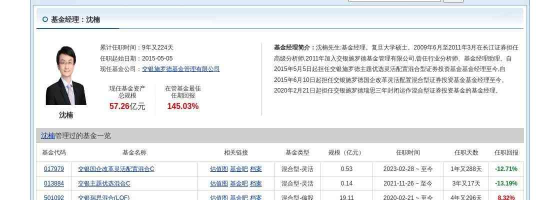 简历显示,沈楠先生:基金经理。复旦大学硕士。29年6月至2011年3月在长江证券担任高级分析师,2011年加入交银施罗德基金管理有限公司,曾任行业分析师、基金经理助理。自2015年5月5日起担任交银施罗德主题优选灵活配置混合型证券投资基金基金经理至今,自2015年6月10日起担任交银施罗德国企改革灵活配置混合型证券投资基金基金经理至今。2020年2月21日起担任交银施罗德瑞思三年封闭运作混合型证券投资基金的基金经理。
