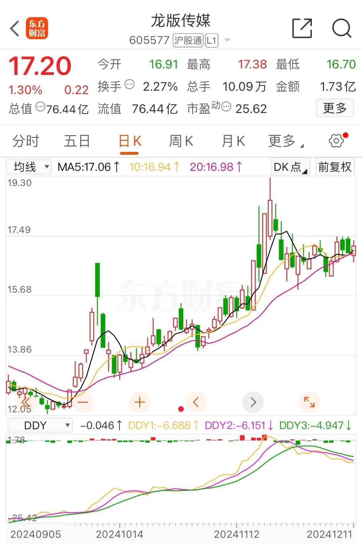 (2.)龙版传媒(605577),文化传媒,今天股票价格:17.20元/股,涨幅:1.30 %;今年以来涨幅:-26.02 %。