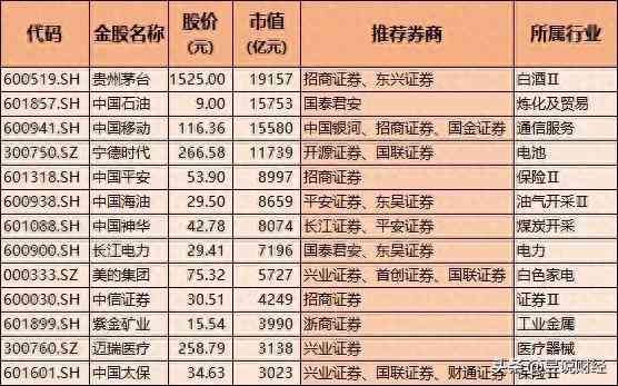 包含:贵州茅台(国内高端白酒龙头,招商与东兴两家券商推荐)、中国石油、中国移动、中国平安(综合金融集体,白马龙头,招商证券推荐)、长江电力(运营世界最大的水电站,即三峡电站)、紫金矿业(国内最大的黄金、铜等矿产生产企业之一)、中国太保,具体详见图表。