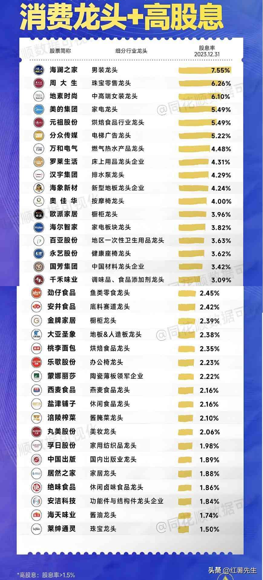 消费板块龙头股一览表,高股息的消费细分龙头股一览