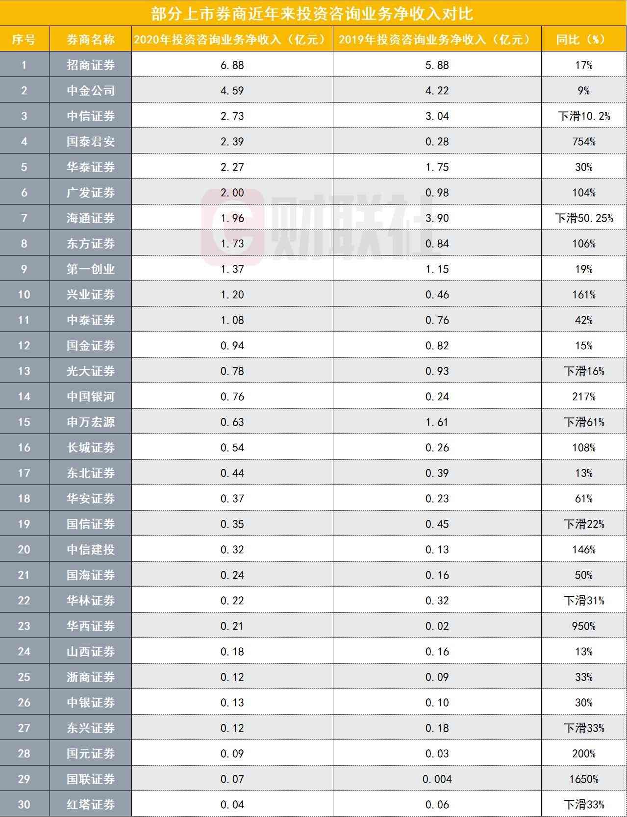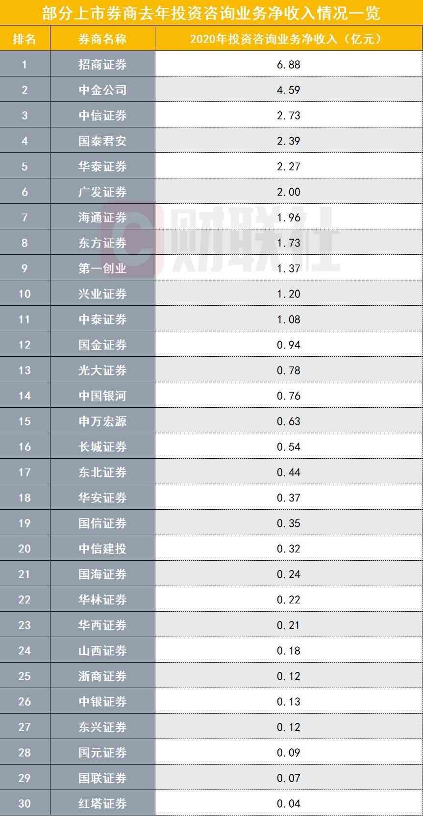 财联社记者根据各家上市券商发布的年报统计,目前有30家上市券商在年报中披露了投资咨询业务净收入数据。