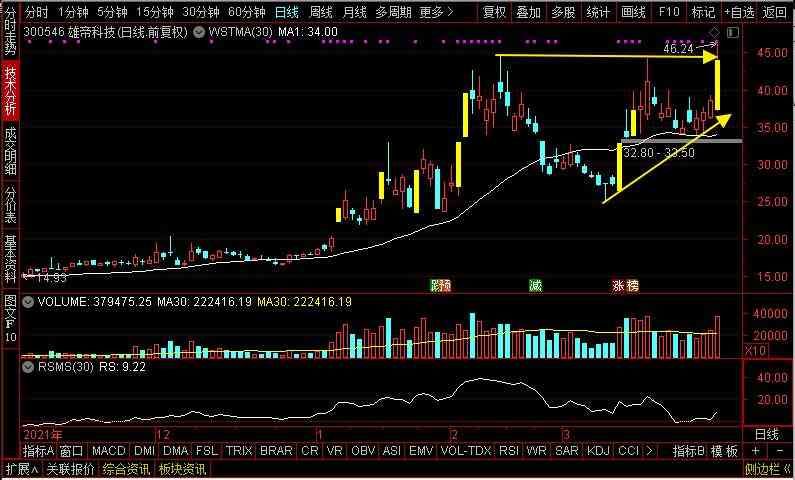 而实际上,雄帝科技的价格也是在呈收敛走势的,走出了一个上升三角形形态。
