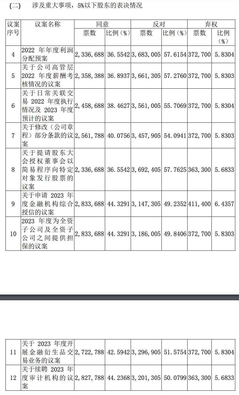 这一点,从龙头股份所披露的“涉及重大事情,5%以下股东的表决情况”也可窥见:9项所列议案无一例外地,均是反对票比例大幅压过同意票。