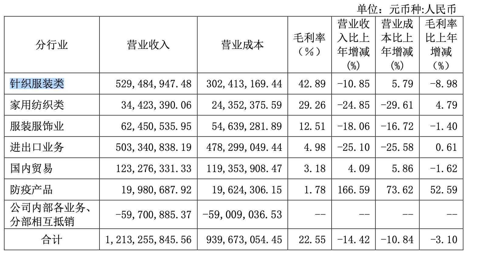 从半年报披露的数据来看,龙头股份业务分行业结构来看:针织服装类营业收入为5.29亿元,营收占比最大为43.64%,毛利率为42.89%;次之的是“进出口业务”,营业收入为5.03亿元,营收占比为41.48%,但毛利率仅为4.98%;国内贸易收入1.23亿元,占营业收入的10%,毛利率为3.18%。