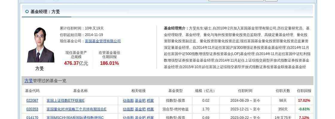 简历显示,方旻先生:硕士,自2010年2月加入富国基金管理有限公司,历任定量研究员、基金经理助理、基金经理、量化与海外投资部量化投资总监助理、高级定量基金经理、量化投资部量化投资副总监、量化投资部量化投资总监;现任富国基金量化投资部量化投资总监兼资深定量基金经理。自2014年11月起任富国沪深3增强证券投资基金基金经理;自2014年11月起任富国中证5指数增强型证券投资基金(LOF)基金经理;自2014年11月起任富国中证红利指数增强型证券投资基金基金经理;自2014年11月起任上证综指交易型开放式指数证券投资基金基金经理;自2015年10月起任富国上证综指交易型开放式指数证券投资基金联接基金基金经理;自2018年05月起任富国中证1指数增强型证券投资基金(LOF)基金经理;自2019年01月起任富国MSCI中国A股国际通指数增强型证券投资基金基金经理;自2020年02月起任富国量化对冲策略三个月持有期灵活配置混合型证券投资基金基金经理;自2022年11月起任富国中证1优选股票型证券投资基金基金经理;具有基金从业资格。