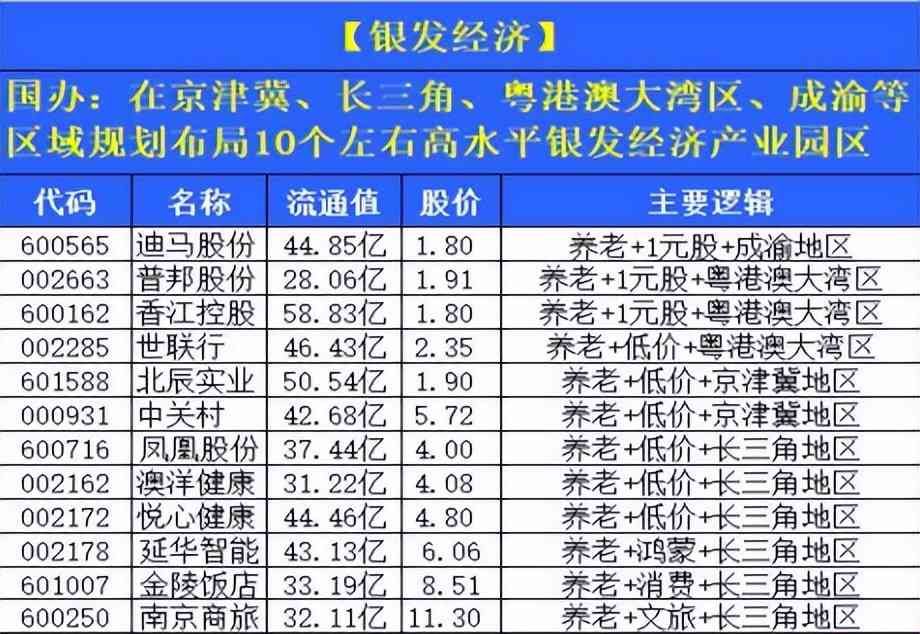 另外,这次提到在京津冀、长三角、粤港澳大湾区、成渝等区域,规划布局10 个左右高水平银发经济产业园区。昨晚这个吹的比较多,作为参考: