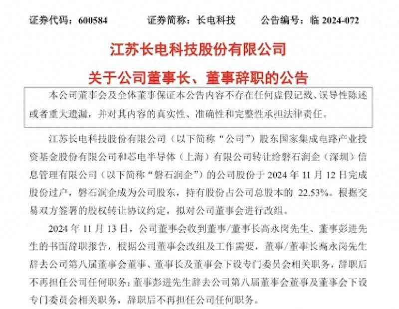 11月13日晚间,芯片封测龙头长电科技(6584.SH)连发多条公告。公告显示,公司包括董事长高永岗在内的4人同日辞职。而其背后原因或源自今年3月的股份转让事宜。