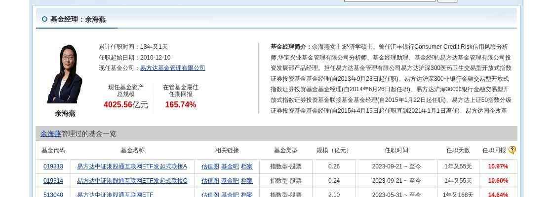 简历显示,余海燕女士:经济学硕士。曾任汇丰银行Consumer Credit Risk信用风险分析师,华宝兴业基金管理有限公司分析师、基金经理助理、基金经理,易方达基金管理有限公司投资发展部产品经理。担任易方达基金管理有限公司易方达沪深3医药卫生交易型开放式指数证券投资基金基金经理(自2013年9月23日起任职)、易方达沪深3非银行金融交易型开放式指数证券投资基金基金经理(自2014年6月26日起任职)、易方达沪深3非银行金融交易型开放式指数证券投资基金联接基金基金经理(自2015年1月22日起任职)、易方达上证50指数分级证券投资基金基金经理(自2015年4月15日起任职直到2021年1月1日离任)、易方达国企改革指数分级证券投资基金基金经理(自2015年6月15日至2021年1月1日任职)、易方达军工指数分级证券投资基金基金经理(自2015年7月8日至2021年1月1日任职)、易方达证券公司指数分级证券投资基金基金经理(自2015年7月8日起任职直到20211年1月1日离任)、易方达沪深3交易型开放式指数发起式证券投资基金基金经理(自2016年4月16日起任职)、易方达中证5交易型开放式指数证券投资基金基金经理(自2016年4月16日起任职)、易方达沪深3交易型开放式指数发起式证券投资基金联接基金基金经理(自2016年4月16日起任职)、易方达中证海外中国互联网50交易型开放式指数证券投资基金基金经理(自2017年1月4日起任职)、易方达中证军工交易型开放式指数证券投资基金基金经理(自2017年7月14日至2021年4月15日)、易方达中证全指证券公司交易型开放式指数证券投资基金基金经理(自2017年7月27日至2021年4月15日)、易方达沪深3医药卫生交易型开放式指数证券投资基金联接基金基金经理(自2017年11月22日起任职)、易方达黄金交易型开放式证券投资基金联接基金基金经理(自2018年8月11日至2021年4月15日)、易方达恒生中国企业交易型开放式指数证券投资基金联接基金基金经理(自2018年8月11日起任职)、易方达黄金交易型开放式证券投资基金基金经理(自2018年8月11日至2021年4月15日)、易方达恒生中国企业交易型开放式指数证券投资基金基金经理(自2018年8月11日起任职)、易方达中证海外中国互联网50交易型开放式指数证券投资基金联接基金基金经理(自2019年1月18日起任职)、易方达中证5交易型开放式指数证券投资基金发起式联接基金基金经理(自2019年3月20日起任职),易方达日兴资管日经225交易型开放式指数证券投资基金(QDII)基金经理(自2019年6月12日起任职)。2022年11月1日起任易方达中证军工交易型开放式指数证券投资基金、易方达中证军工指数证券投资基金(LOF)基金经理。