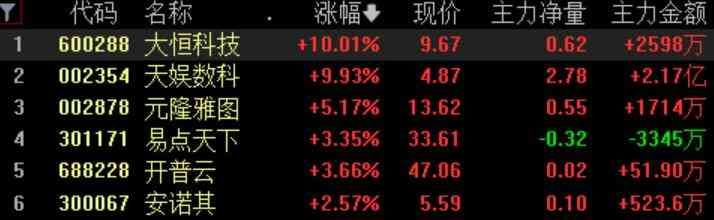 大恒科技、天娱数科涨停,易点天下、开普云等跟涨。