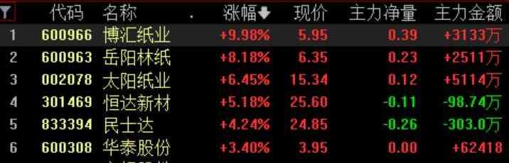 博汇纸业涨停,岳阳林纸、太阳纸业均涨超5%。