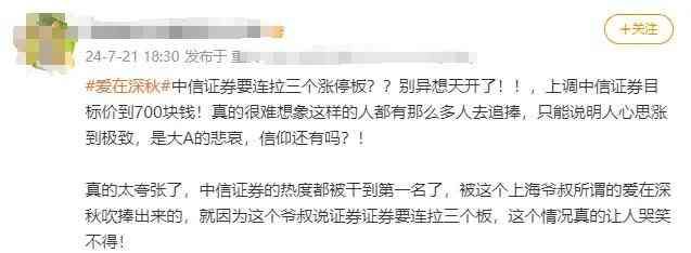 原因说来也蹊跷,竟是一位被称作“爱在深秋”的上海大爷对这两只股的点评,在短视频平台广泛流传。一些网上流传的切片视频和截图显示,其甚至表示,中信证券股价能“直接看多到700元”“7月22日起三连板”。
