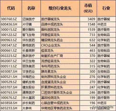 包含:迈瑞医疗(医疗设备研发商,其医疗器械远销190多个国家)、片仔癀(国宝神药,国家队重仓,国家一级中药保护品种)、泰格医药(CRO龙头,具有高效的项目交付能力)、鱼跃医疗(产品线丰富,制氧机生产龙头,社保基金重仓,养老金重仓)等,详见图表。