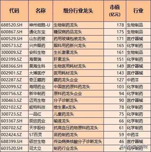 包含:神州细胞(在重组凝血八因子领域处于领先)、通化东宝(糖尿病药品龙头,社保基金重仓,外资阿布达比重仓)、昊海生科(生物医用耗材龙头,涉及眼科、医美、骨科及防粘连四大领域)、新华制药(原料药龙头企业,从事原料药、制剂等研发制造)等。