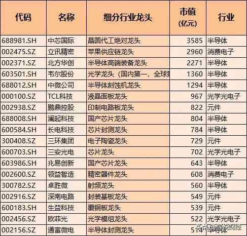 包含:中芯国际(晶圆代工龙头)、立讯精密(苹果供应链龙头,中央汇金与证金重仓)、北方华创(半导体龙头)、韦尔股份(全球第三大CMOS图像传感器芯片设计龙头企业)、鹏鼎控股(全球最大的PCB生产企业,社保基金重仓)等,详见图表。