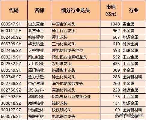 包含:山东黄金(国内金矿龙头,拥有丰富的金矿资源,社保基金重仓)、北方稀土(全球稀土资源龙头,储量丰富,技术领先)、南山铝业(拥有完整铝加工产业链,国家队证金公司重仓,社保基金重仓)、厦门钨业(钨冶炼产品加工及钨粉生产龙头,社保基金重仓,险资重仓)、金力永磁(市值为288亿元,稀土材料龙头)。