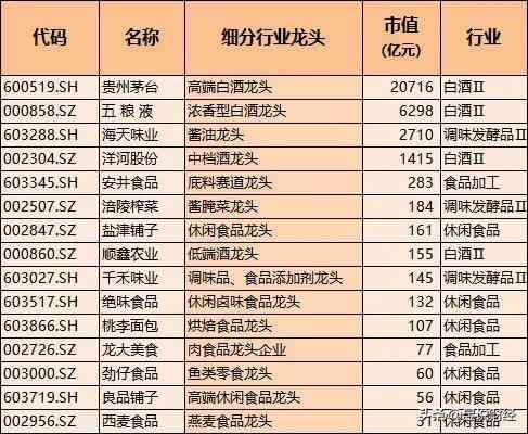 食品饮料行业龙头,包含:贵州茅台(品牌底蕴深厚,市场影响力强大的白酒龙头,市值超2万亿,国家队重仓)、五粮液(浓香型白酒龙头,历史悠久,汇金与证金重仓)、涪陵榨菜(榨菜行业龙头,占有30%的市场份额)、千禾味业(零添加调味品企业,酱油龙头,社保基金重仓)、良品铺子(高端零食行业龙头)。