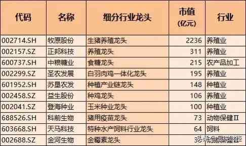 农牧养殖行业龙头,包含:牧原股份(生猪养殖行业龙头企业,市值超22亿元,券商重仓)、正邦科技(国内农业产业化龙头企业)、中粮糖业(国内最大的糖生产和贸易企业,澳门金融管理局重仓,摩根士丹利重仓,险资重仓)、益生股份(白羽肉鸡种源领域龙头,私募重仓,券商重仓)、科前生物等。