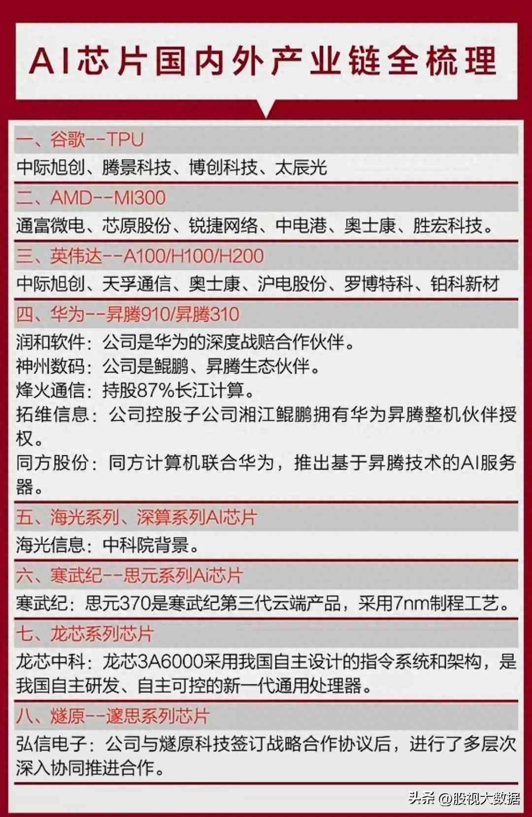 太辰光(TPU系列)、罗博特科(MI3系列)、同方股份(昇腾系列)、海光信息(深算系列)、寒武纪(思元系列)、龙芯中科(龙心系列)……