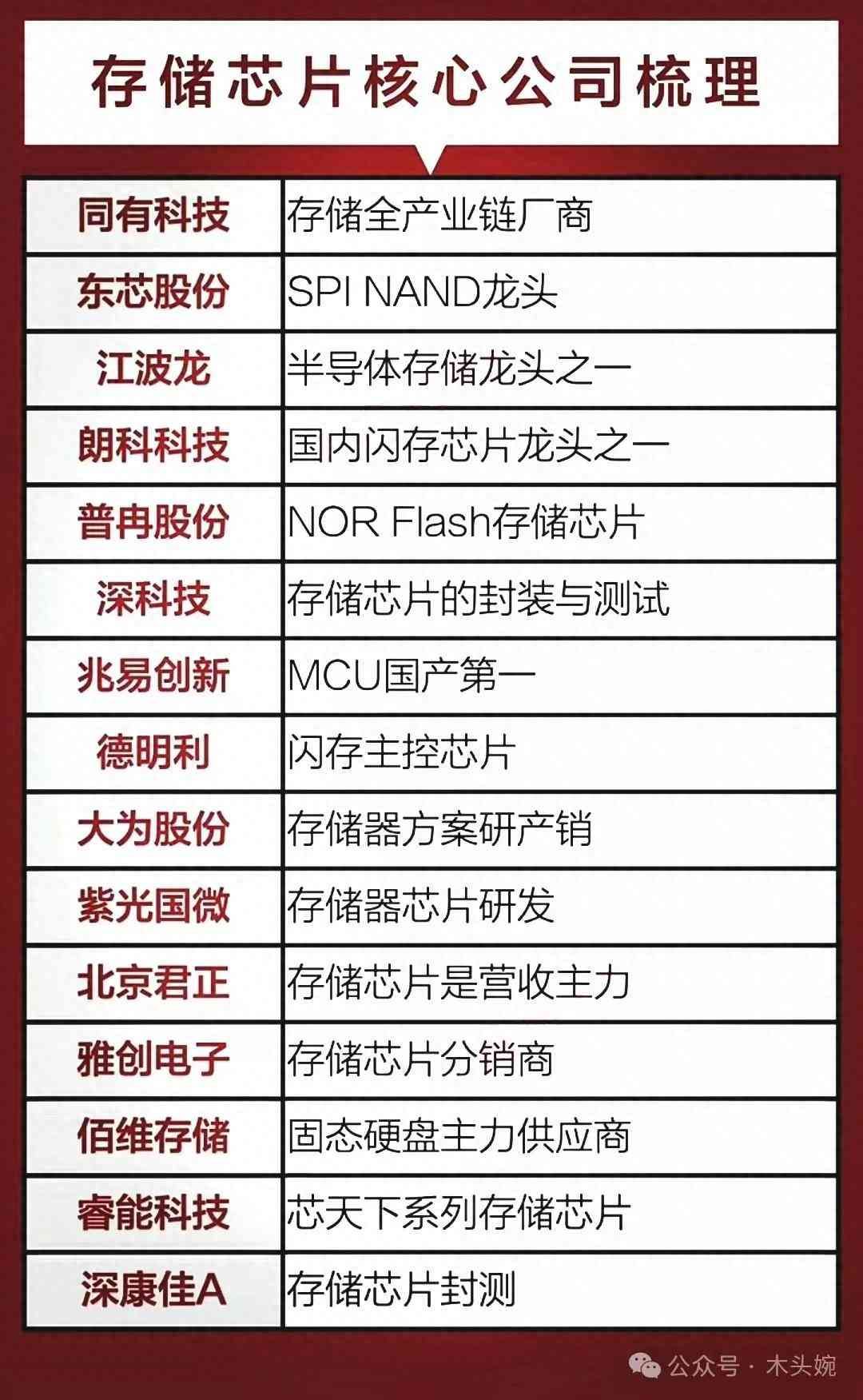储存芯片龙头代表:半导体储存龙头江波龙、闪存芯片龙头朗科科技、储存芯片封测龙头深科技、储存芯片营收龙头北京君正……