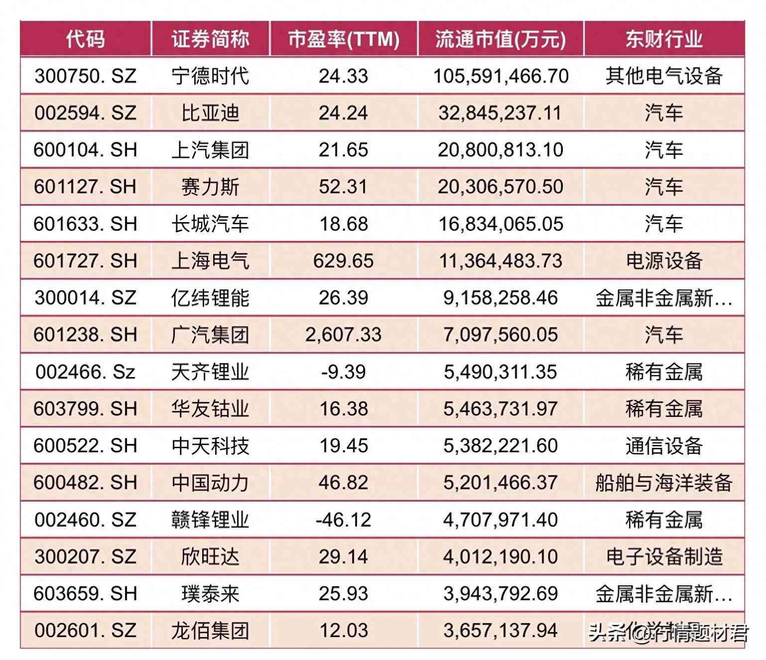 宁德时代(电池龙头)、比亚迪(汽车)、上汽集团(汽车)、赛力斯(汽车)、长城汽车(汽车)、上海电气(电源设备)、亿纬锂能(金属非金属)、广汽集团(汽车)、天齐锂业(稀有金属)、华友钴业(稀有金属)、中天科技(通信设备)、中国动力(船舶与海洋装备)、赣锋锂业(稀有金属)、欣旺达(电子设备制造)、璞泰来(金属非金属)、龙佰集团(化学制品)