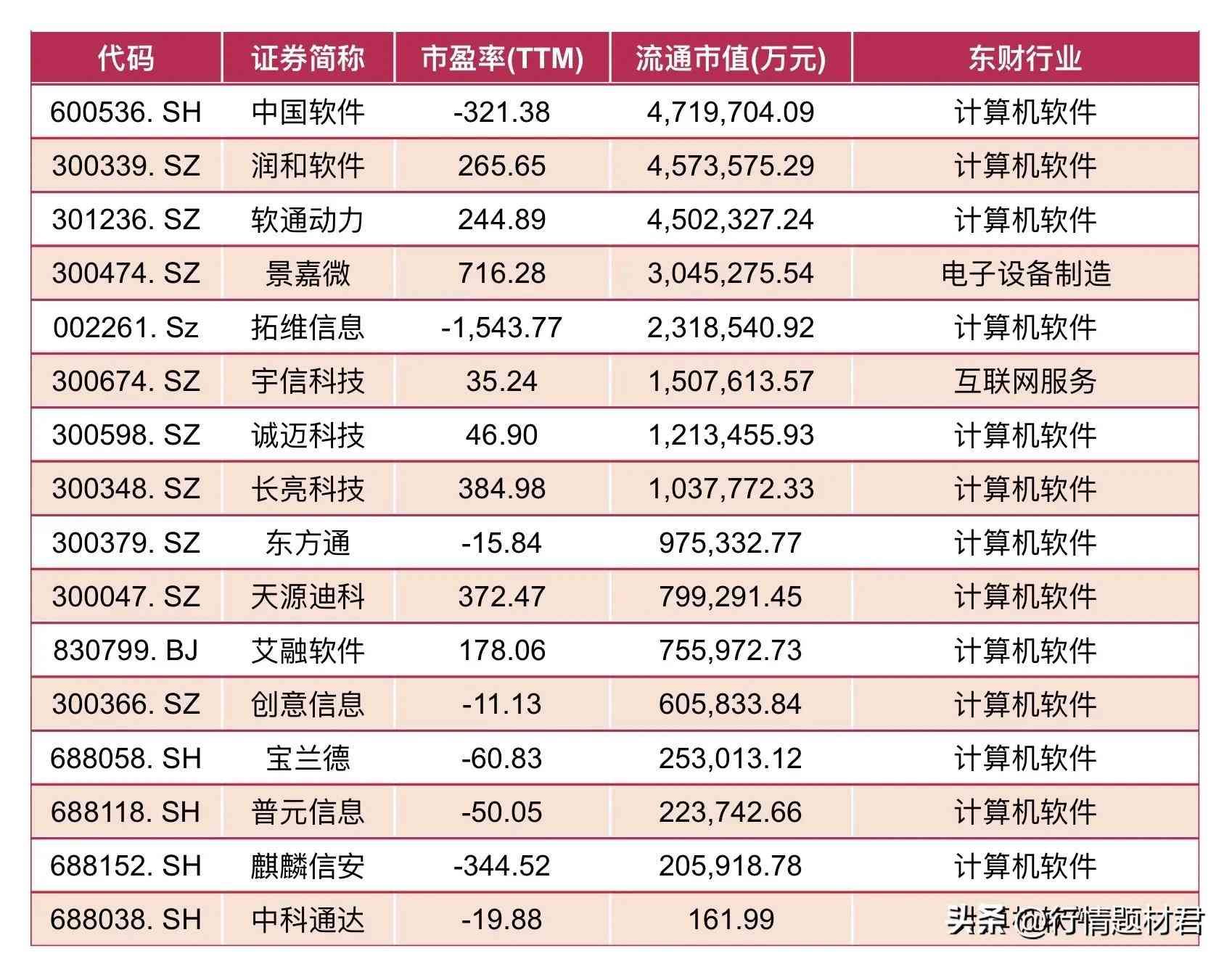 中国软件(计算机软件)、润和软件(计算机软件)、软通动力(计算机软件)、景嘉微(电子设备制造)、拓维信息(计算机软件)、宇信科技(互联网服务)、诚迈科技(计算机软件)、长亮科技(计算机软件)、东方通(计算机软件)、天源迪科(计算机软件)、艾融软件(计算机软件)、创意信息(计算机软件)、宝兰德(计算机软件)、普元信息(计算机软件)、麒麟信安(计算机软件)、中科通达(计算机软件)