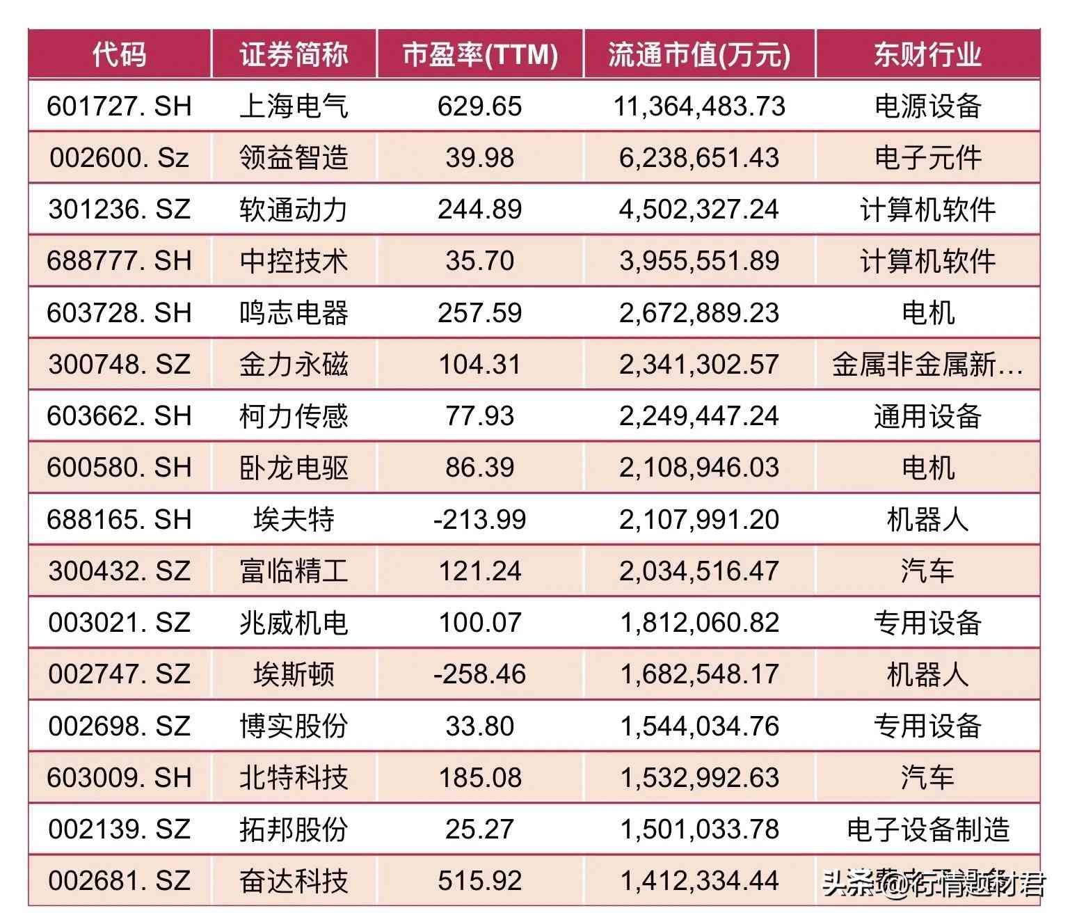 上海电气(电源设备)、领益智造(电子元件)、中控技术(计算机软件)、鸣志电器(电机)、金力永磁(金属非金属)、柯力传感(通用设备)、卧龙电驱(电机)、埃夫特(机器人)、富临精工(汽车)、兆威机电(专用设备)、埃斯顿(机器人)、博实股份(专用设备)、北特科技(汽车)、拓邦股份(电子设备制造)、奋达科技(消费电子设备)
