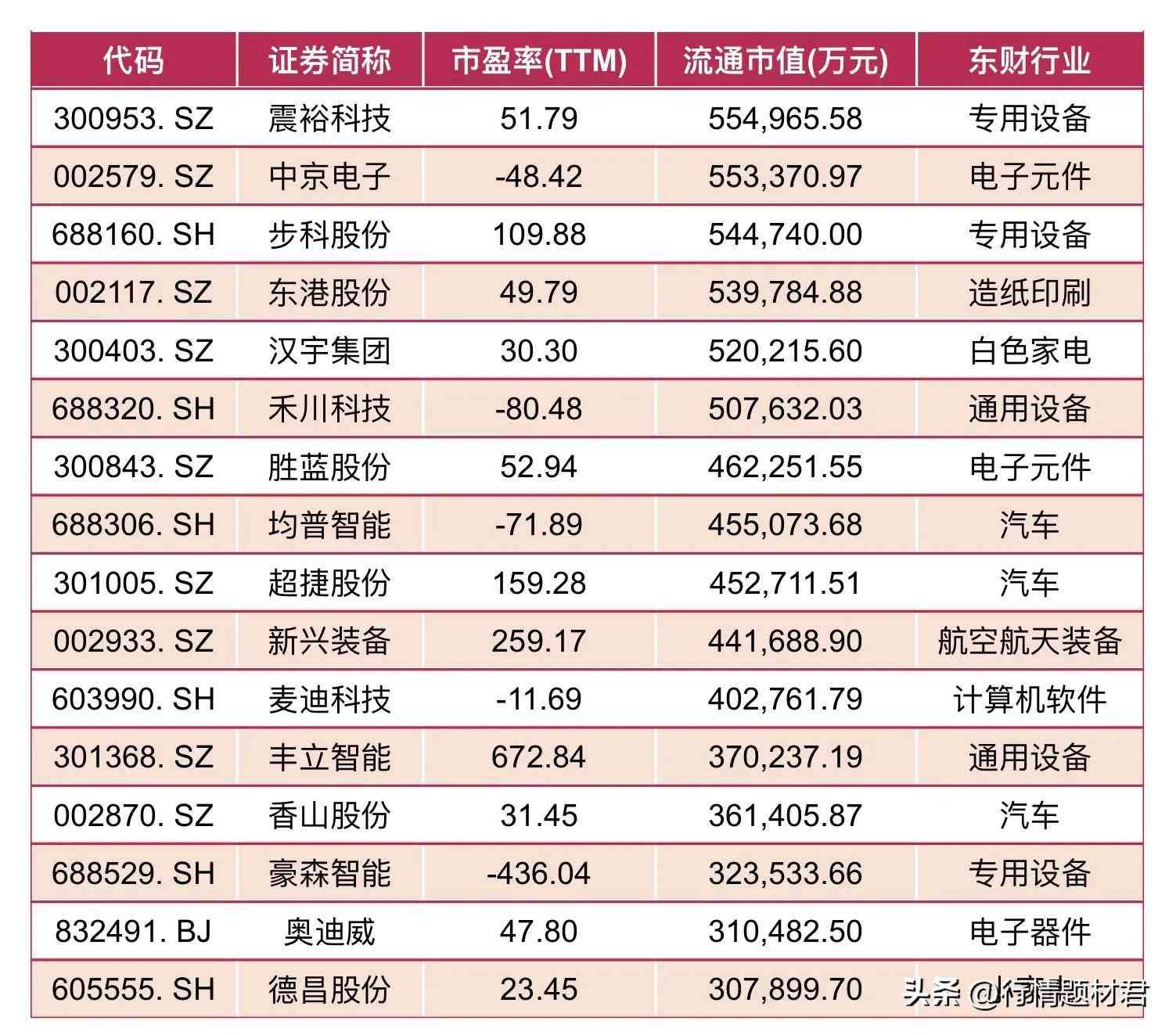 震裕科技(专用设备)、中京电子(电子元件)、步科股份(专用设备)、东港股份(造纸印刷)、汉宇集团(白色家电)、禾川科技(通用设备)、胜蓝股份(电子元件)、均普智能(汽车)、超捷股份(汽车)、新兴装备(航空航天装备)、麦迪科技(计算机软件)、丰立智能(通用设备)、香山股份(汽车)、豪森智能(专用设备)、奥迪威(电子器件)、德昌股份(小家电)