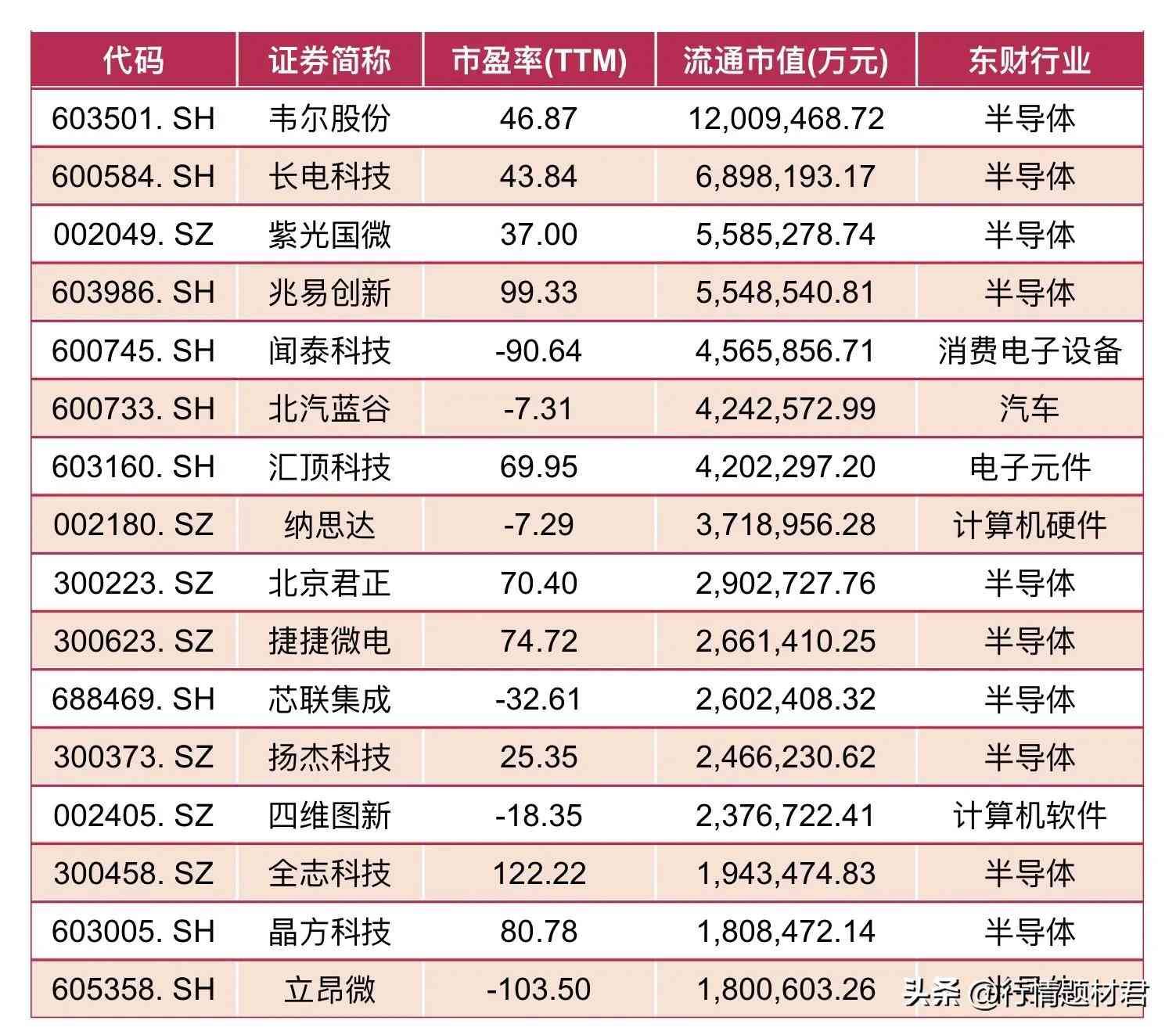 韦尔股份(半导体)、长电科技(半导体)、紫光国微(半导体)、兆易创新(半导体)、闻泰科技(消费电子设备)、北汽蓝谷(汽车)、汇顶科技(电子元件)、纳思达(计算机硬件)、北京君正(半导体)、捷捷微电(半导体)、芯联集成(半导体)、扬杰科技(半导体)、四维图新(计算机软件)、全志科技(半导体)、晶方科技(半导体)、立昂微(半导体)