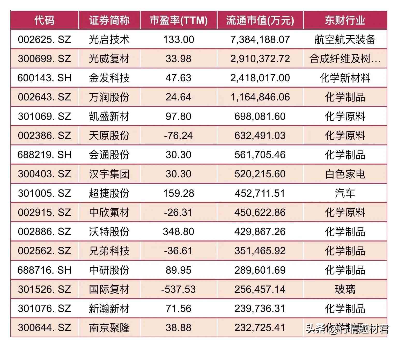 光启技术(航空航天装备)、光威复材(合成纤维及树脂)、金发科技(化学新材料)、万润股份(化学制品)、凯盛新材(化学原料)、天原股份(化学原料)、会通股份(化学制品)、汉宇集团(白色家电)、超捷股份(汽车)、中欣氟材(化学原料)、沃特股份(化学制品)、兄弟科技(化学制品)、中研股份(化学制品)、国际复材(玻璃)、新瀚新材(化学制品)、南京聚隆(化学制品)。