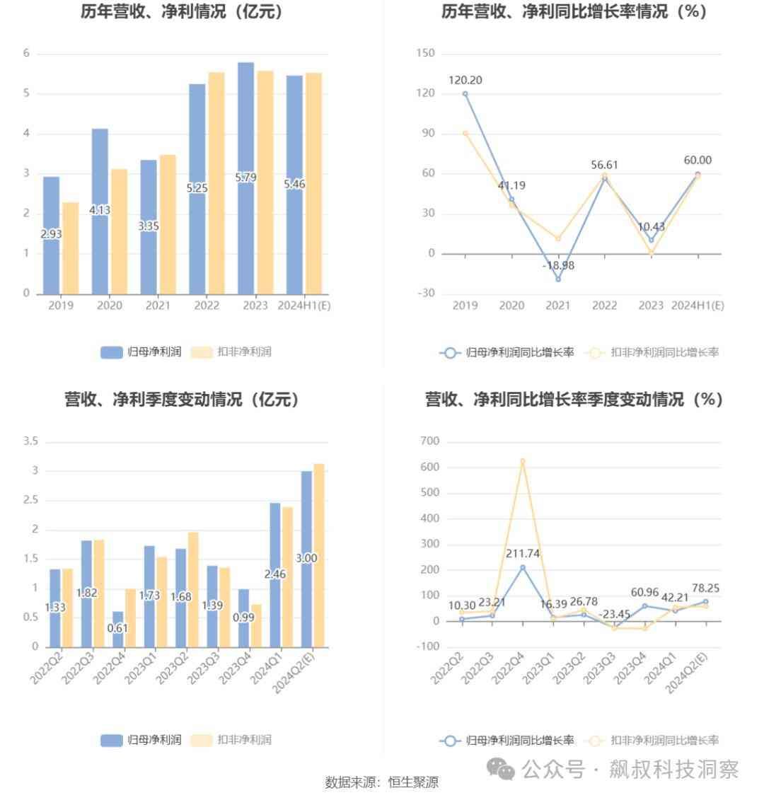 7月5日,澜起科技发布公告,2024年上半年预计实现营业收入16.65亿元,较上年同期增长79.49%;实现净利润5.83亿元-6.23亿元,同比增长612.73%-661.59%(6.13倍-6.62倍);实现扣非净利润5.35亿元-5.65亿元,同比大增139.25倍-147.12倍。