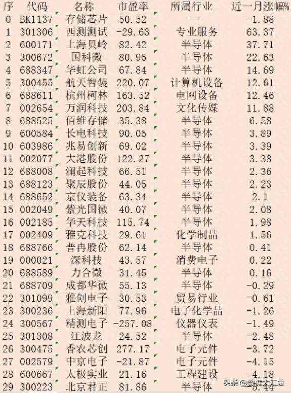 存储器芯片股票代码,存储芯片概念股,近一个月涨跌幅排名: