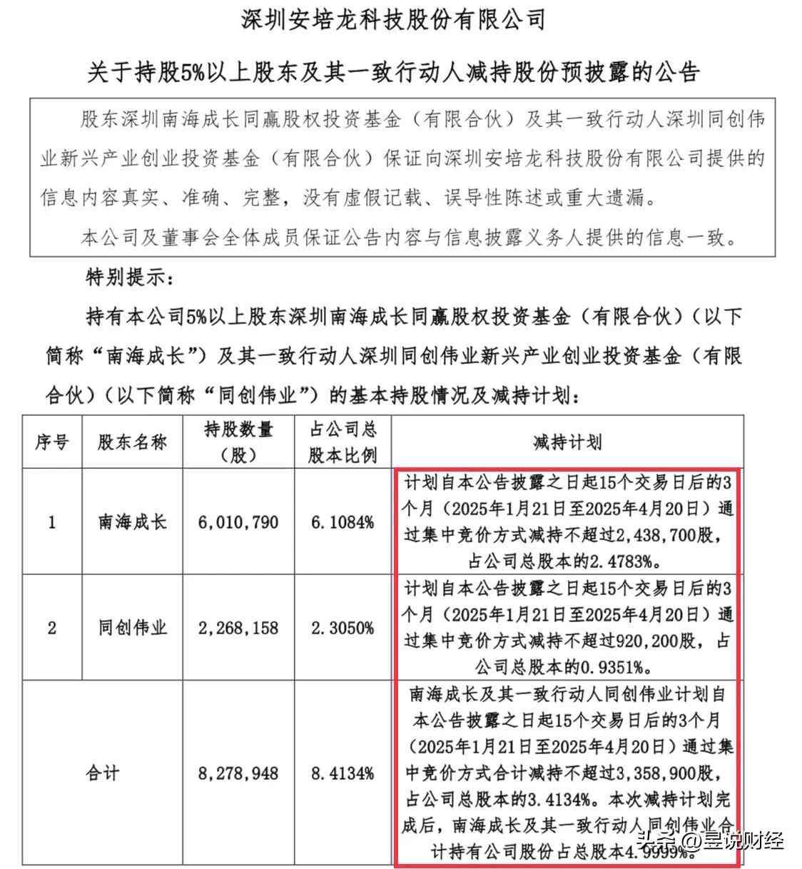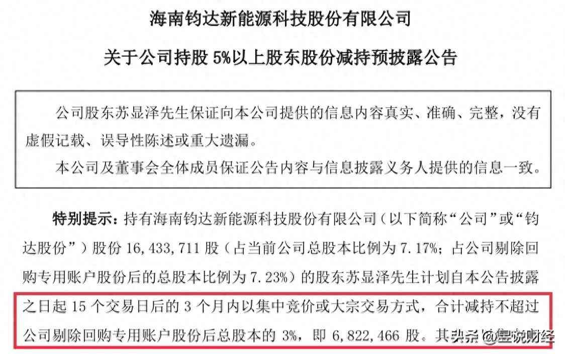 钧达股份是一家光伏设备生产企业,中外合资企业,位于海南省。钧达股份的大股东苏显泽先生减持,减持股份数量占总股本比例为3%,预估减持金额为3.6亿元。