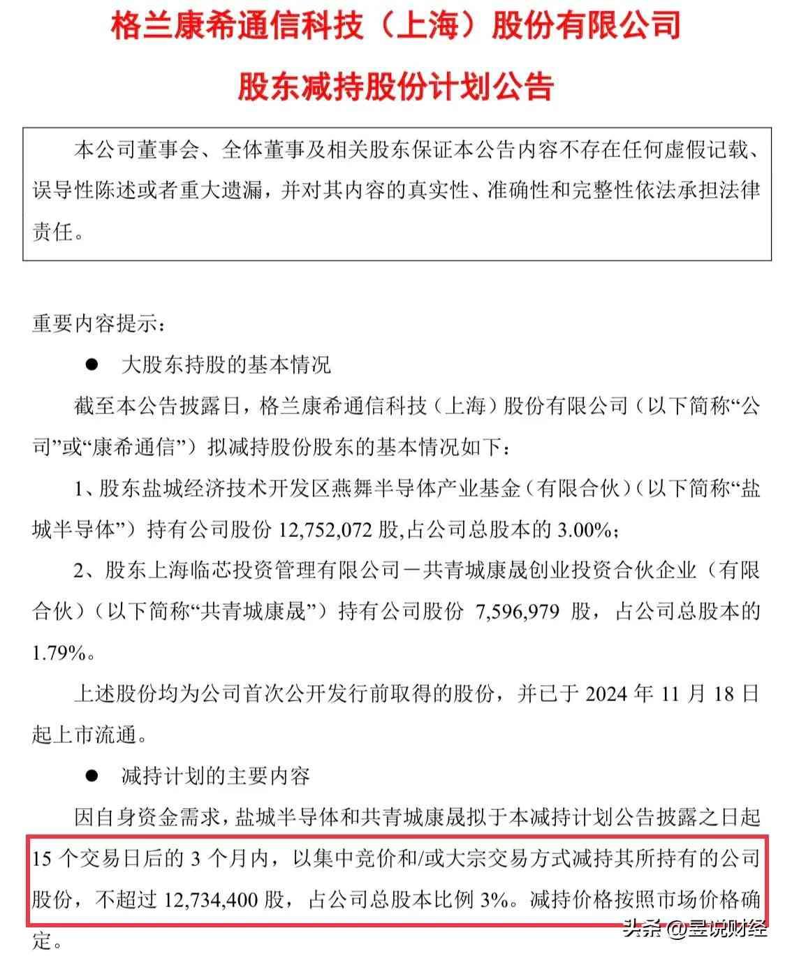 康希通信是一家位于上海市的模拟芯片设计企业,是国内较早实现Wi-Fi FEM量产及规模化应用的企业。康希通信被盐城半导体和共青城康晟两个股东减持,二者合计减持比例为3%,减持金额为1.82亿元。