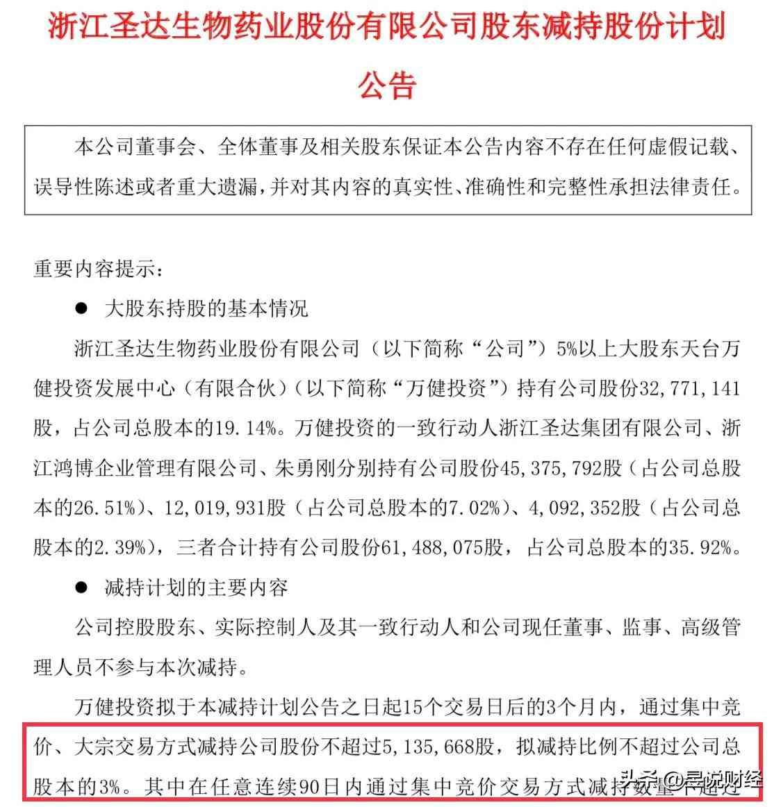 圣达生物主营维生素、生物保鲜剂、食品添加剂的研发生产,位于浙江省。圣达生物的大股东万健投资减持,减持股份数量占总股本比例为3%。