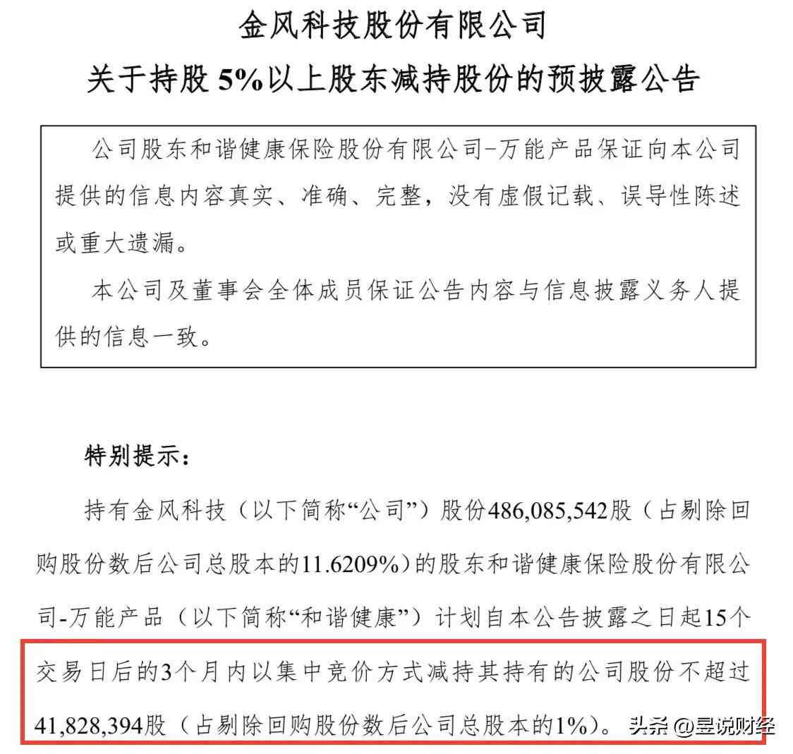 金风科技主营风电设备生产,国企,风电市占率国内第一、全球第二。金风科技的大股东和谐健康保险减持4183万股,涉及的金额高达4.39亿元。
