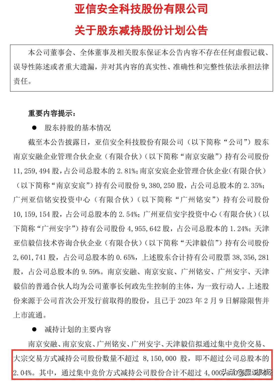 亚信安全是国内网络信息安全龙头,2022年2月上市。亚信安全的5名股东联合减持,即南京安融、南京安宸、广州铭安、广州安宇、天津毅信,合计减持金额为1.58亿元。